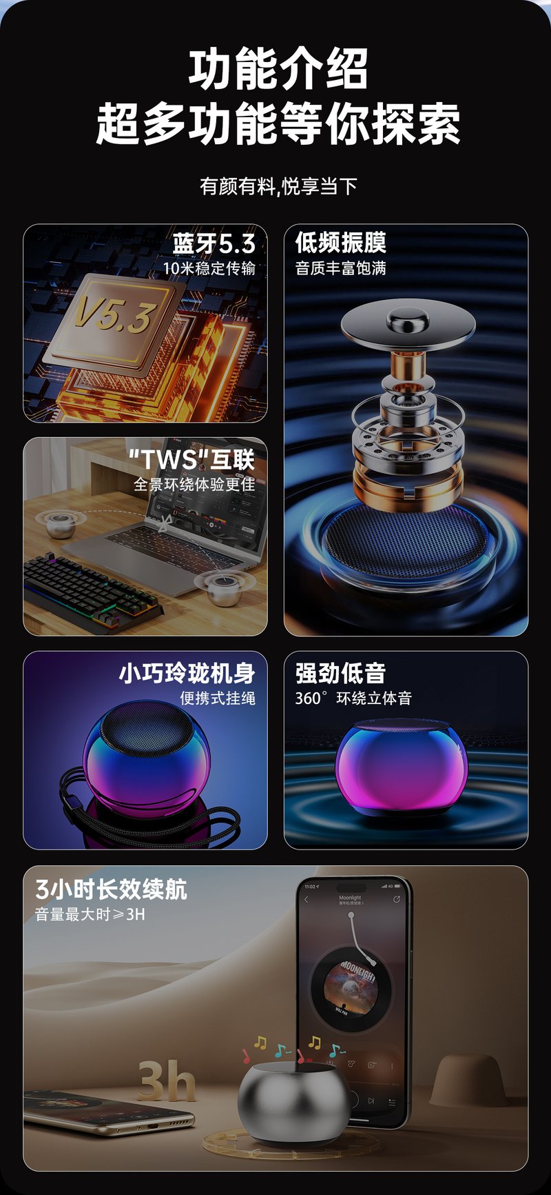 25分鐘前炫彩無線藍牙音箱,戶外便攜,小音響大音量,多重音效, 360°全向音效 - 5入組 均價339!NT$1699